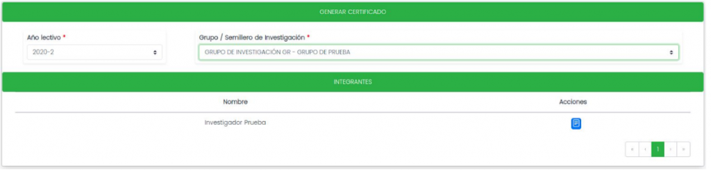 Para cada uno de los integrantes de los grupos y semilleros de investigación es posible generar un certificado de participación siempre y cuando haya sido aprobado previamente desde la funcionalidad de aprobar trabajo de grupo/semillero por el líder de grupo o semillero, o por un usuario administrador.