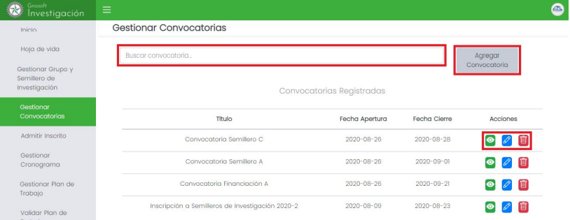 En la opción Agregar Convocatoria se hará el registro, así mismo hay una barra de búsqueda y la opción de Ver, Modificar o Eliminar las convocatorias ya existentes.
