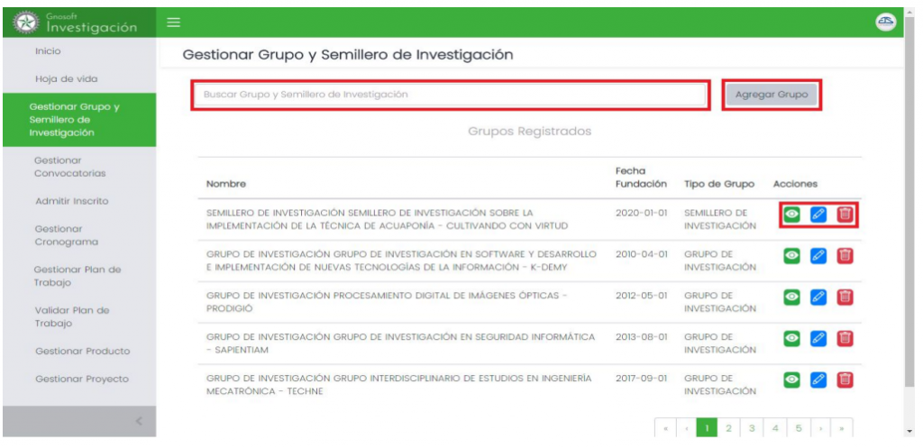 En esta funcionalidad podremos agregar los nuevos grupos y semilleros de investigación, asimismo podremos ver modificar y eliminar los grupos ya existentes, tenemos una barra de búsqueda y un paginado.