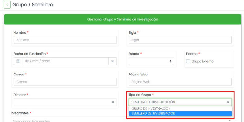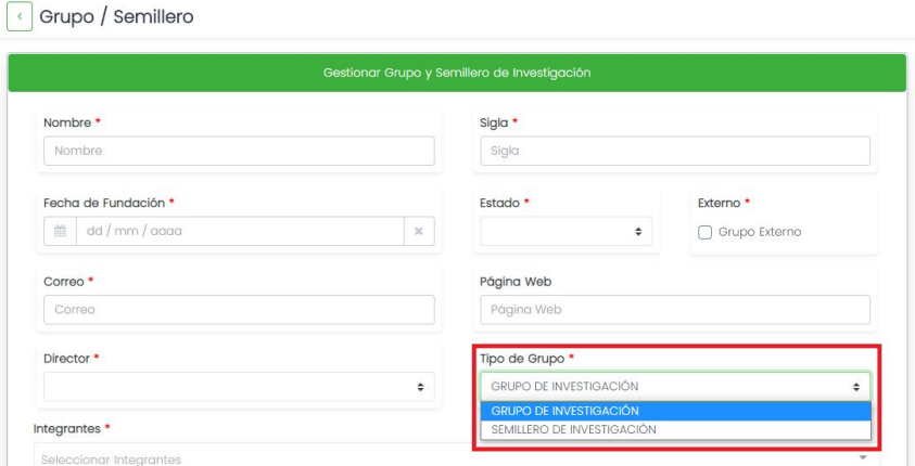 Al agregar un nuevo grupo, para diferenciar un grupo o un semillero de investigación en el campo llamado tipo de grupo tenemos la opción de seleccionar el que corresponda.