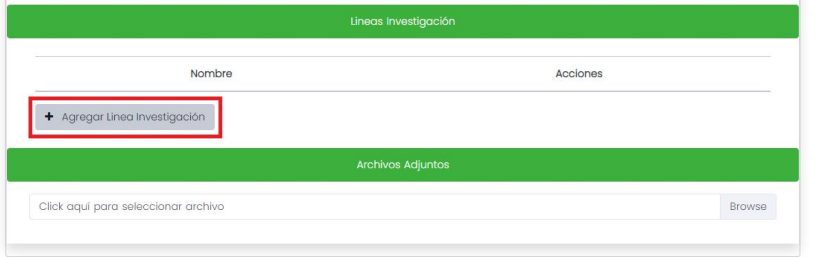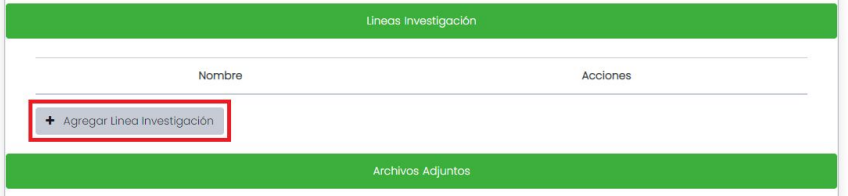categoría y en la sección de Líneas Investigación damos clic sobre el botón + Agregar