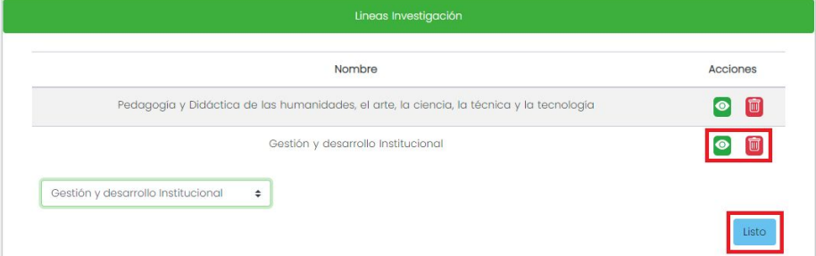 Al igual que el grupo cuando esté seleccionada la línea requerida damos clic en el botón Listo para que esta línea se guarde, en caso de que se haya escogido la incorrecta podemos modificarlas dando clic sobre el ojo o si se desea eliminar, damos clic sobre la papelera.