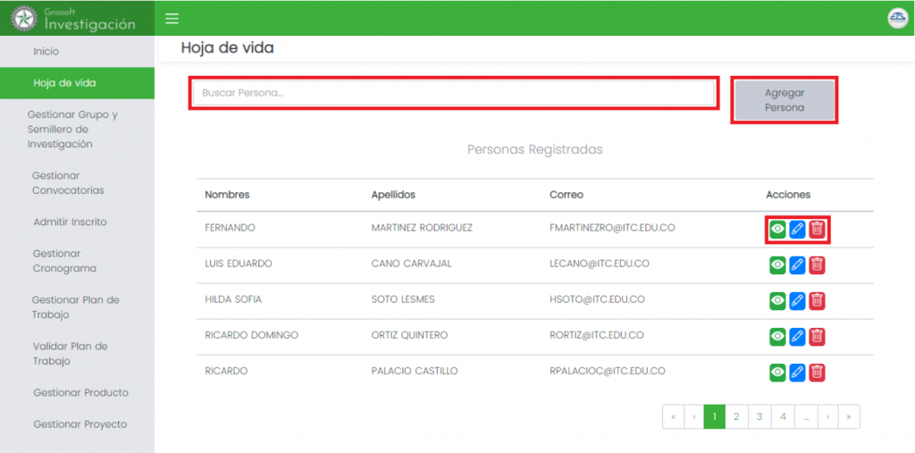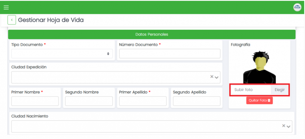 La funcionalidad hoja de vida permite registrar, actualizar o eliminar información de las