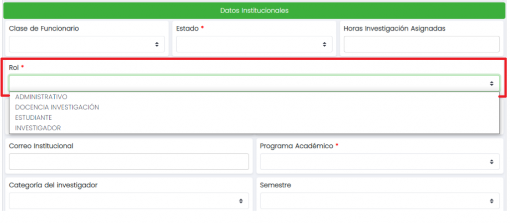 Se debe tener en cuenta que en la sección de datos institucionales se debe seleccionar el rol que tendrán las personas registradas en el sistema.