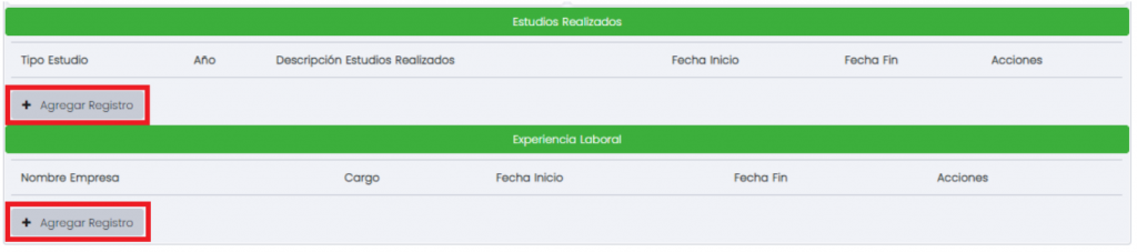 Podremos agregar Estudios Realizados y Experiencia Laboral seleccionando el botón +