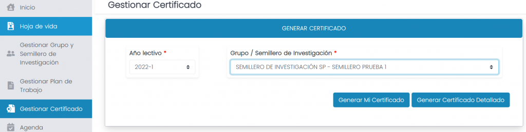Para obtener un certificado de las actividades realizadas dentro de un semillero o grupo de investigación debemos acceder al módulo de investigación etic, una vez aquí nos dirigimos a la funcionalidad “Gestionar Certificado”, seguidamente debemos seleccionar el año correspondiente al semestre en el que nos encontramos y el grupo o semillero de investigación al que pertenecemos.