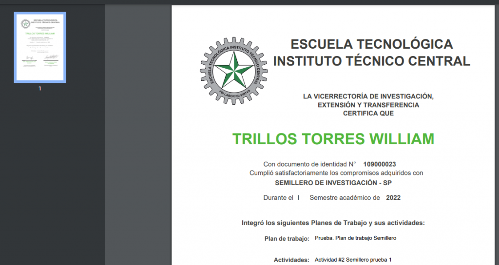 Tendremos dos certificados para descargar, dado caso necesitemos el certificado de participación en el semillero de investigación debemos hacer clic en “Generar mi certificado”, dado caso necesitemos un certificado donde detalle cada una de las actividades que realizamos en el semillero o grupo de investigación debemos seleccionar “Generar Certificado detallado”