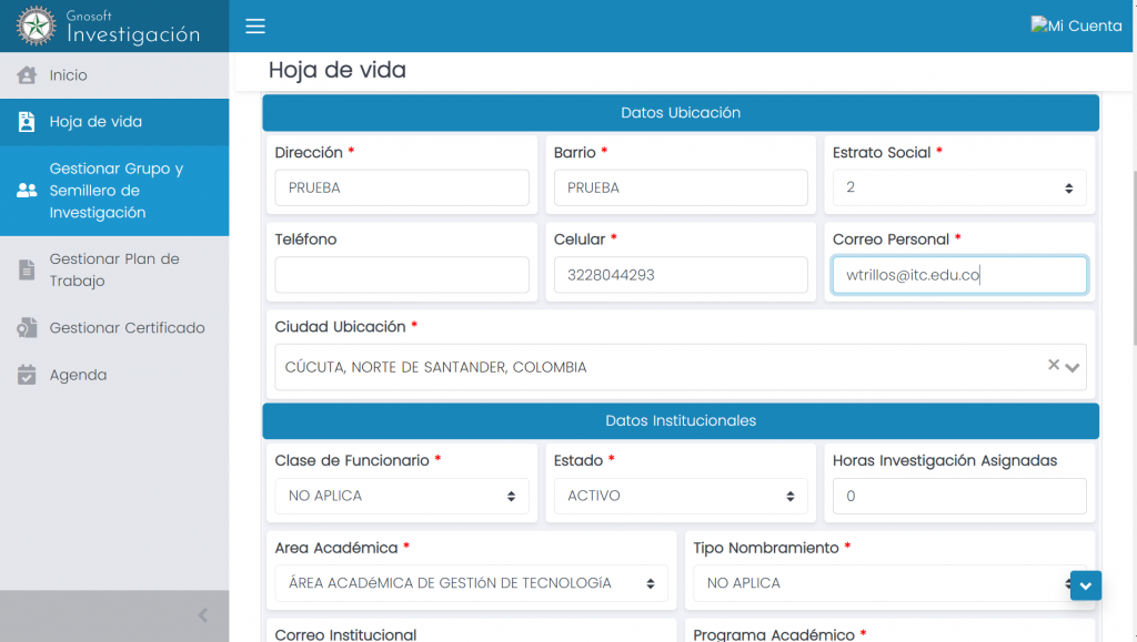 Para actualizar tus datos en la plataforma debes ingresar al módulo de Investigación, seguidamente debes dirigirte a la funcionalidad “Hoja de vida” allí te encontrarás con varias secciones que podrás actualizar los cuales son: